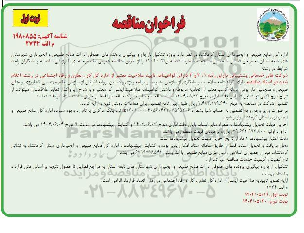 اداره کل منابع طبیعی و آبخیزداری استان کرمانشاه در نظر دارد پروژه تشکیل ارجاع و پیگیری پرونده های حقوقی ادارات منابع طبیعی و آبخیزداری شهرستان های تابعه استان به مراجع قضایی تا حصول نتیجه به شماره مناقصه ق/1404003 را از طریق مناقصه عمومی یک مرحله ای با ارزیابی ساده به پیمانکاران واحد شرایط در رشته شرکت های خدماتی پشتیبانی دارای رتبه 1، 2 و3 دارای گواهینامه تایید صلاحیت معتبر از اداره کل کار، تعاون و رفاه اجتماعی در رشته اعلام شده در اسناد مناقصه دارای گواهینامه صلاحیت پیمانکاری از سازمان مدیریت و برنامه ریزی و داشتن پروانه اشتغال از سازمان نظام مهندسی کشاورزی و منابع طبیعی و همچنین دارا بودن پروانه کسب معتبر از اتحادیه مربوطه و داشتن گواهینامه صلاحیت ایمنی کار معتبر و به شرح زیر واگذار نماید. علاقمندان میتوانند از تاریخ درج آگهی نوبت اول تا پایان وقت اداری مورخ 1404.5.22 استاد مناقصه و سایر مدارک مناقصه را فقط از طریق سامانه ستاد دریافت نمایند.