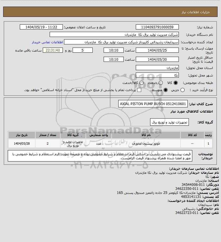 شرح کلی نیاز: AXIAL PISTON PUMP BUSCH 0512410601