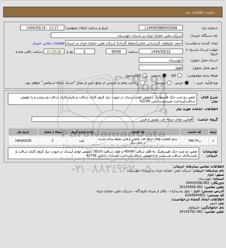 شرح کلی نیاز: تعمیر دو عدد جک هیدرولیک (تعویض لوازم آببندی در صورت نیاز کروم کاری شافت و پالیشکاری شافت وسیلندر و یا تعویض شافت)پرداخت اعتباری داخلی 42749