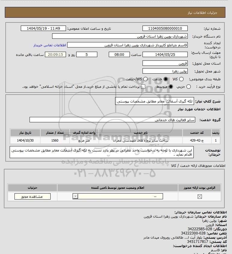 شرح کلی نیاز: لکه گیری آسفالت معابر مطابق مشخصات پیوستی
