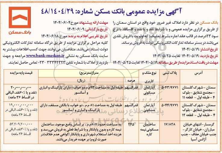 آگهی مزایده عمومی بانک مسکن شماره : 48/1404/29