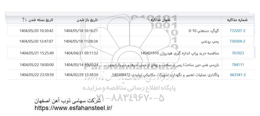 | 663341-2 | واگذاری عملیات تعمیر و نگهداری مکانیکی تولیدی 140308472 | 1404.5.22 |