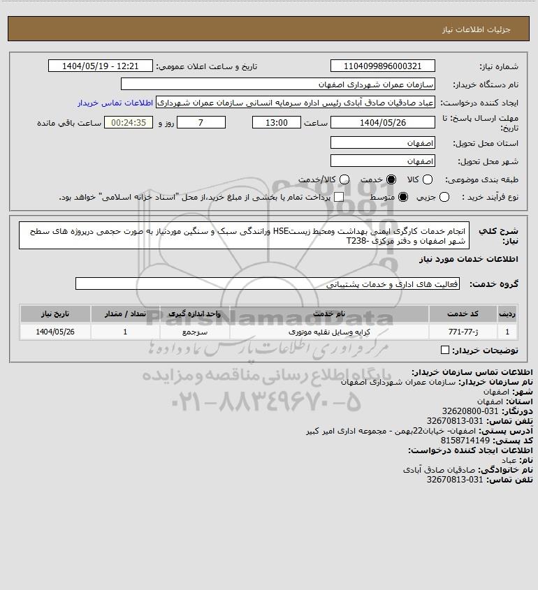 شرح کلی نیاز: انجام خدمات کارگری ایمنی بهداشت ومحیط زیستHSE ورانندگی سبک و سنگین موردنیاز به صورت حجمی درپروژه های سطح شهر اصفهان و دفتر مرکزی -T238