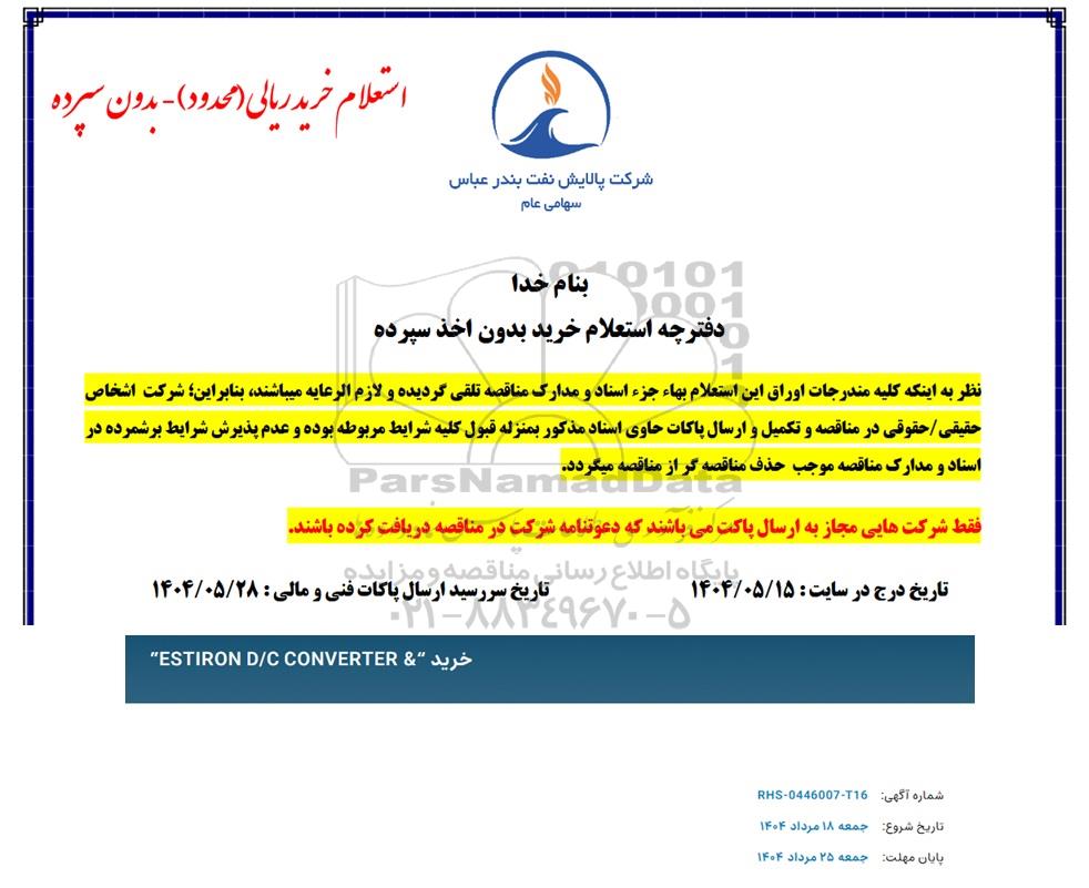 استعلام بها و موضوع استعلام استعلام خرید ESTIRON D/C CONVERTER به اطلاع کلیه شرکتها و افراد متخصص واجد شرایط میرساند، آگهی گذار در نظر دارد از طریق استعلام بها، نسبت به انتخاب و دریافت پیشنهادات اقدام نماید. این استعلام با کد آگهی ثبت شده در سامانه خبرگزاری پارس نماد : 9388145 منتشر شده است. مشخصات استعلام : تاریخ شروع استعلام: 1404/05/19 آخرین مهلت ارسال پیشنهاد قیمت : 1404/05/28 و محل اجرای پروژه : استان هرمزگان میباشد. استعلام قیمت مورد درخواست : استعلام خرید ESTIRON D/C CONVERTER با دستهبندیهای تخصصی و گروه های مرتبط : انواع کلید و پریزهای برقی و صنعتی, تجهیزات نفت و گاز, تجهیزات برق و الکترونیک, استعلام اطلاع رسانی میگردد.