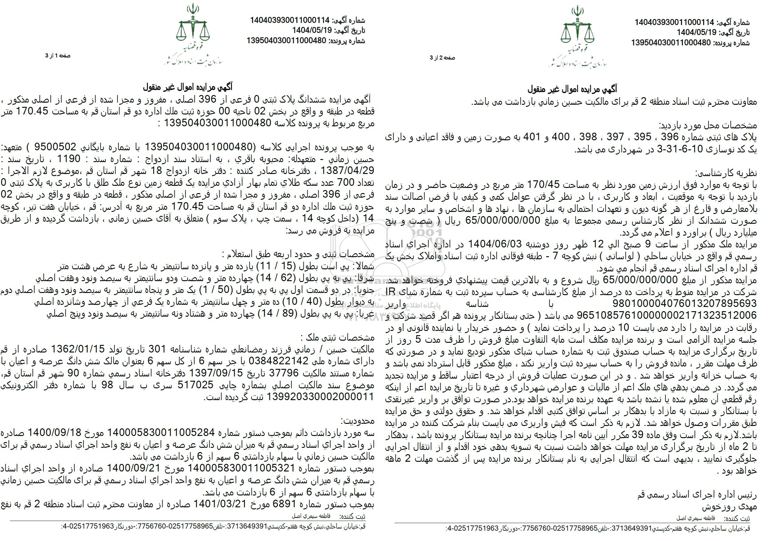 مزایده ششدانگ پلاک ثبتی 0 فرعی از 396 اصلی، مفروز و مجزا شده از فرعی از اصلی
