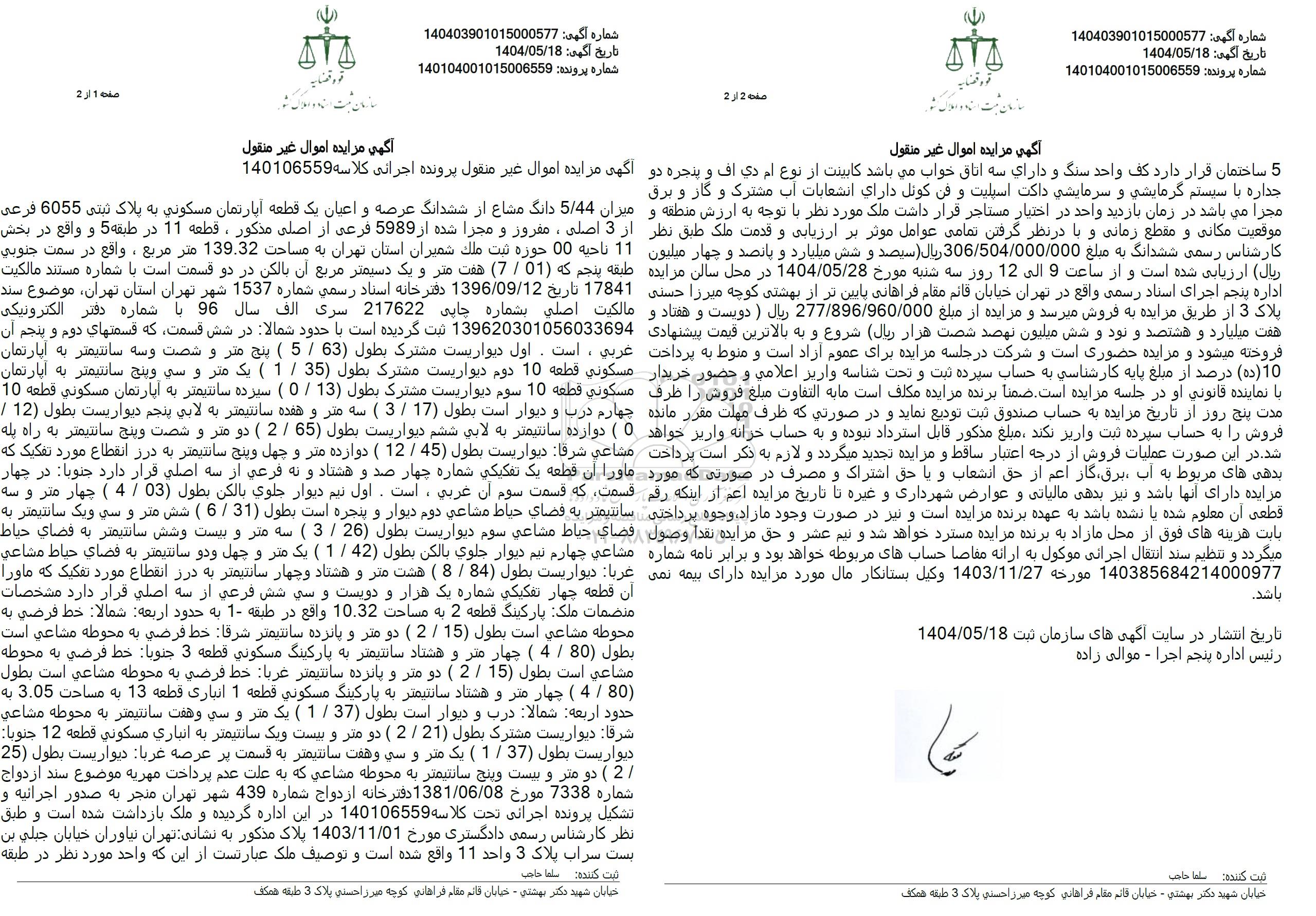 مزایده میزان 5.44 دانگ مشاع از ششدانگ عرصه و اعیان یک قطعه آپارتمان مسکونی به پلاک ثبتی 6055 فرعی از 3 اصلی
