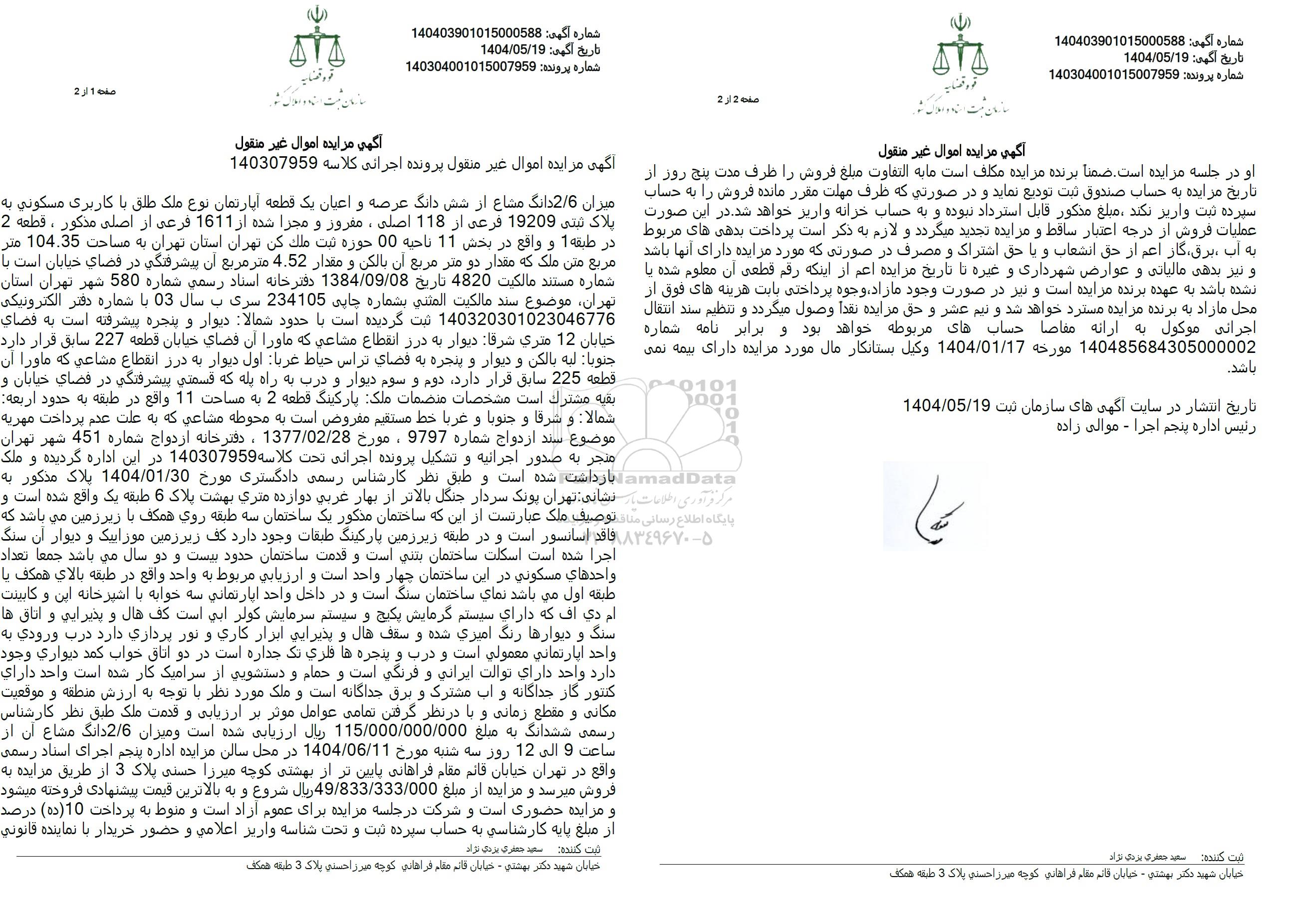 مزایده فروش یک قطعه آپارتمان مسکونی به پلاک ثبتی 19209 فرعی از 118 اصلی, مزایده فروش یک قطعه آپارتمان مسکونی به پلاک ثبتی 19209 فرعی از 118 اصلی