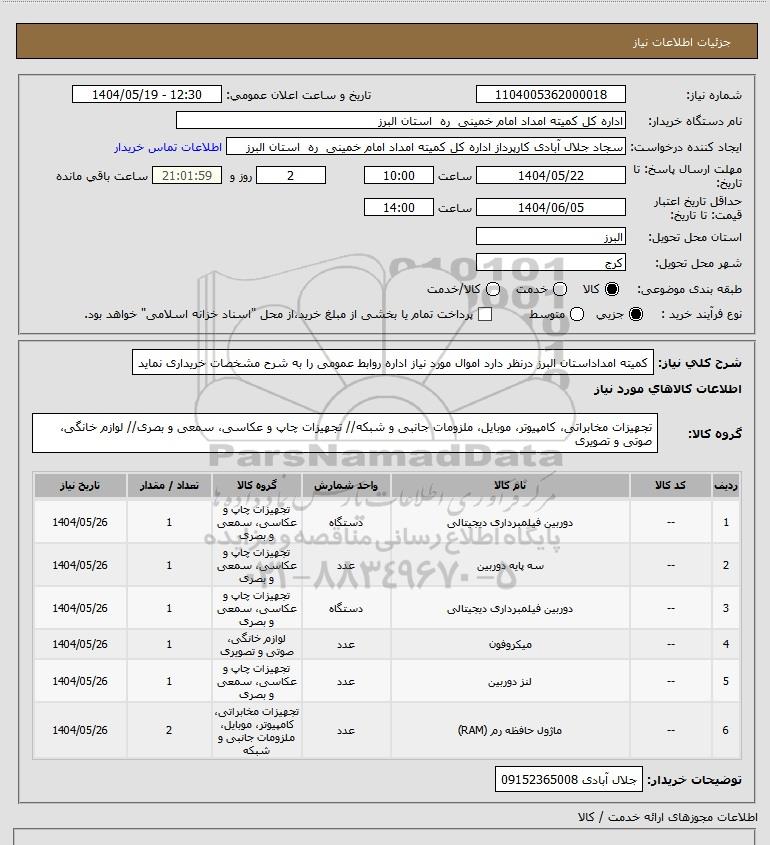 استعلام بها و موضوع استعلام استعلام کمیته امداداستان البرز درنظر دارد اموال مورد نیاز اداره روابط عمومی را به شرح مشخصات خریداری نماید به اطلاع کلیه شرکتها و افراد متخصص واجد شرایط میرساند، آگهی گذار در نظر دارد از طریق استعلام بها، نسبت به انتخاب و دریافت پیشنهادات اقدام نماید. این استعلام با کد آگهی ثبت شده در سامانه خبرگزاری پارس نماد : 9388375 منتشر شده است. مشخصات استعلام : تاریخ شروع استعلام: 1404/05/19 آخرین مهلت ارسال پیشنهاد قیمت : 1404/05/22 و محل اجرای پروژه : استان البرز میباشد. استعلام قیمت مورد درخواست : استعلام کمیته امداداستان البرز درنظر دارد اموال مورد نیاز اداره روابط عمومی را به شرح مشخصات خریداری نماید با دستهبندیهای تخصصی و گروه های مرتبط : تجهیزات و لوازم عکاسی و رادیوگرافی, صوت و تصویر - وسایل عکاسی و دیتا پرژکتور, کامپیوتر, استعلام اطلاع رسانی میگردد.