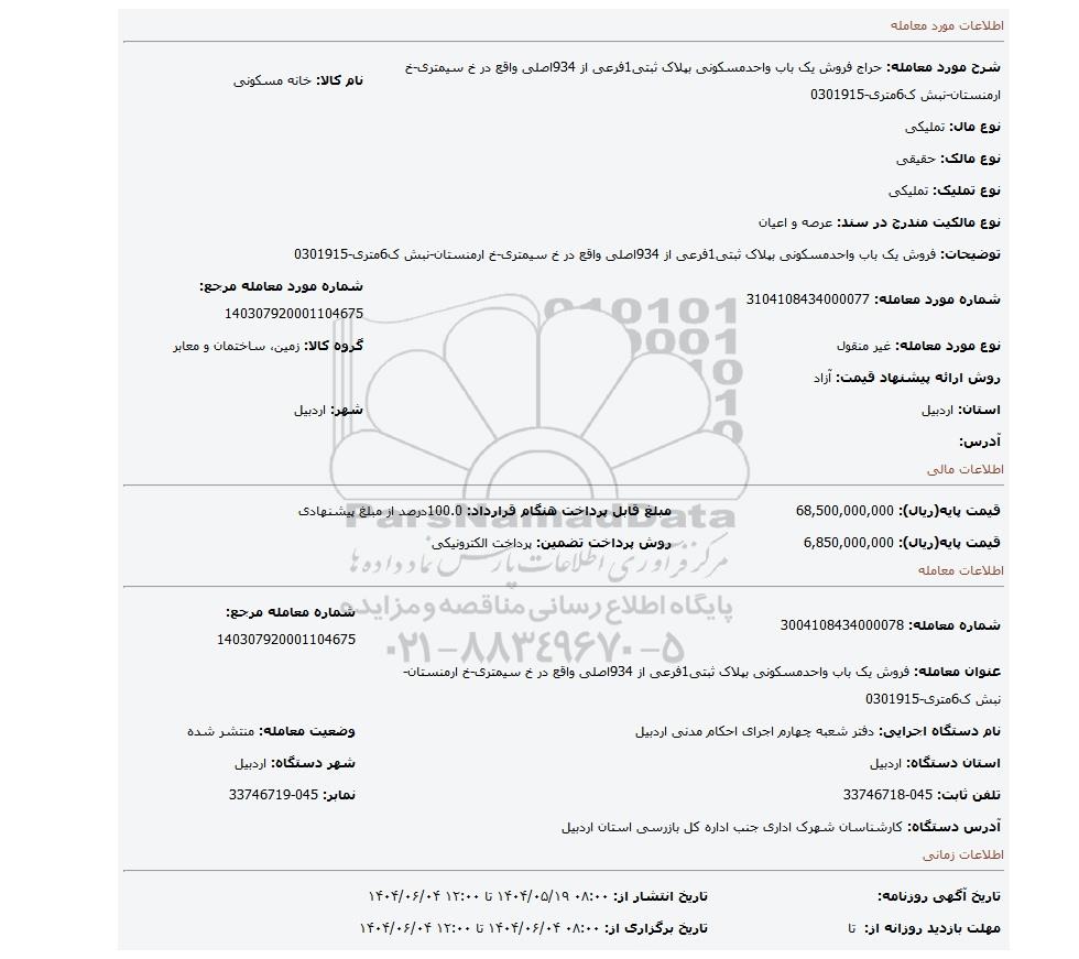 شماره معامله: 3004108434000078 | شماره معامله مرجع: 140307920001104675 | |