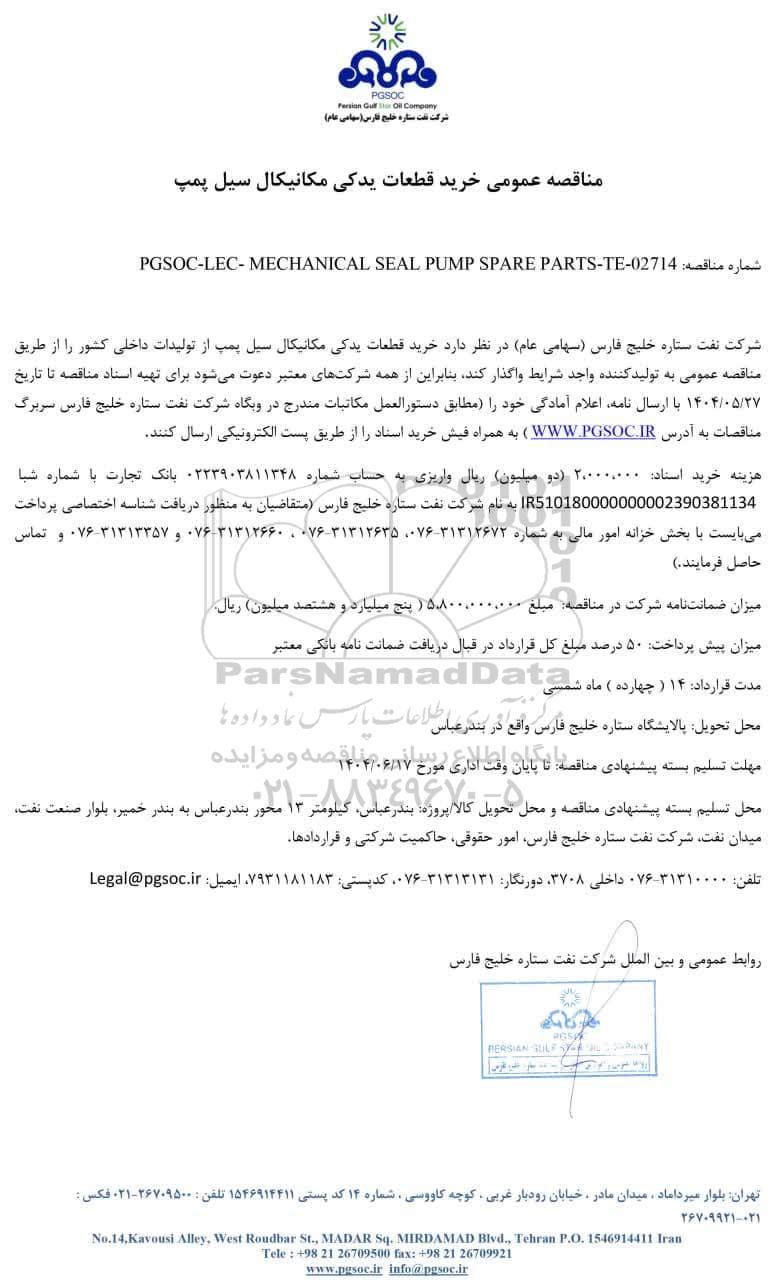 شماره مناقصه: PGSOC-LEC- MECHANICAL SEAL PUMP SPARE PARTS-TE- 02714