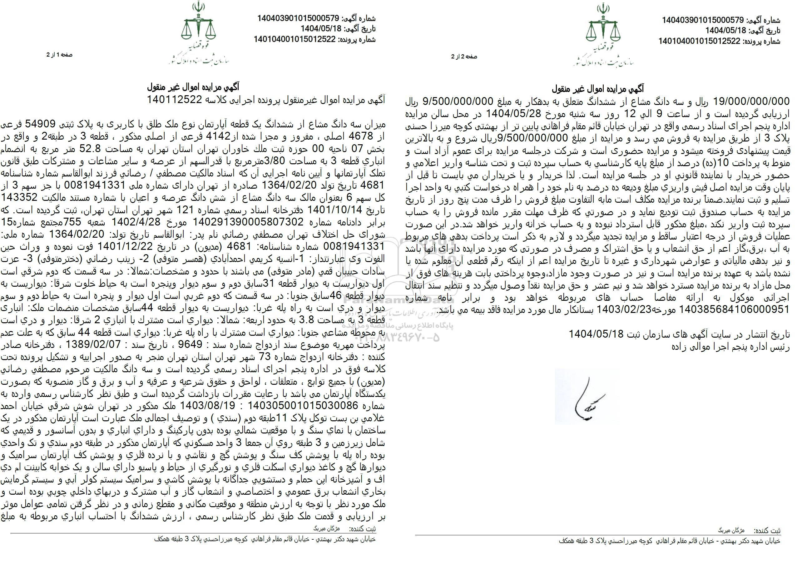 مزایده فروش یک قطعه اپارتمان به پلاک ثبتی 54909 فرعی از 4678 اصلی به مبلغ 9.500.000.000 ریال