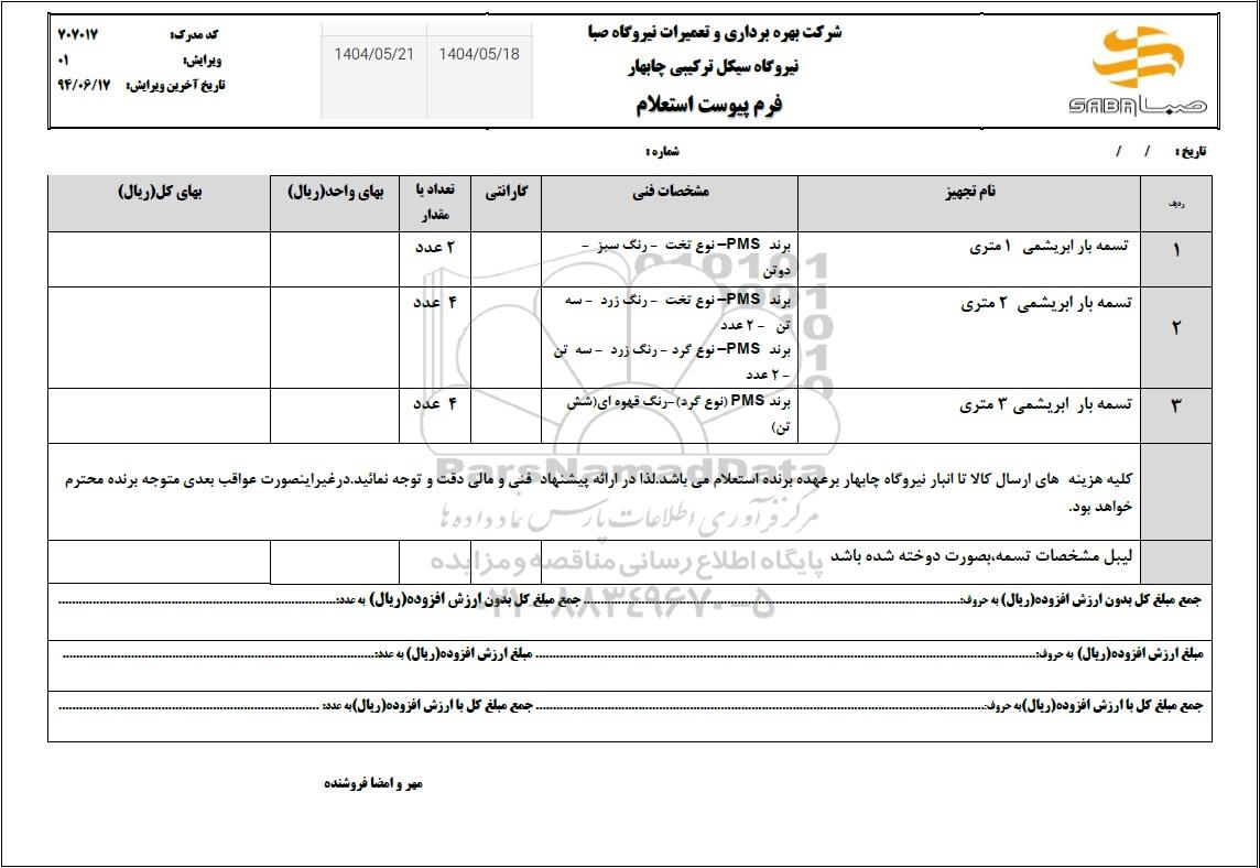 استعلام بها و موضوع استعلام استعلام تسمه بار ابریشمی به اطلاع کلیه شرکتها و افراد متخصص واجد شرایط میرساند، آگهی گذار در نظر دارد از طریق استعلام بها، نسبت به انتخاب و دریافت پیشنهادات اقدام نماید. این استعلام با کد آگهی ثبت شده در سامانه خبرگزاری پارس نماد : 9388832 منتشر شده است. مشخصات استعلام : تاریخ شروع استعلام: 1404/05/19 آخرین مهلت ارسال پیشنهاد قیمت : 1404/05/21 و محل اجرای پروژه : استان سیستان و بلوچستان میباشد. استعلام قیمت مورد درخواست : استعلام تسمه بار ابریشمی با دستهبندیهای تخصصی و گروه های مرتبط : زنجیر صنعتی, نیروگاه, تجهیزات و ماشین آلات صنعتی, تجهیزات برق و الکترونیک, استعلام اطلاع رسانی میگردد. شرایط شرکت در استعلام آنلاین : ابتدا ثبت نام در سامانه استعلام پارس نماد و تکمیل مدارک موردنیاز و بارگذاری در سامانه رعایت تمامی ضوابط و الزامات مندرج در اسناد استعلام است.