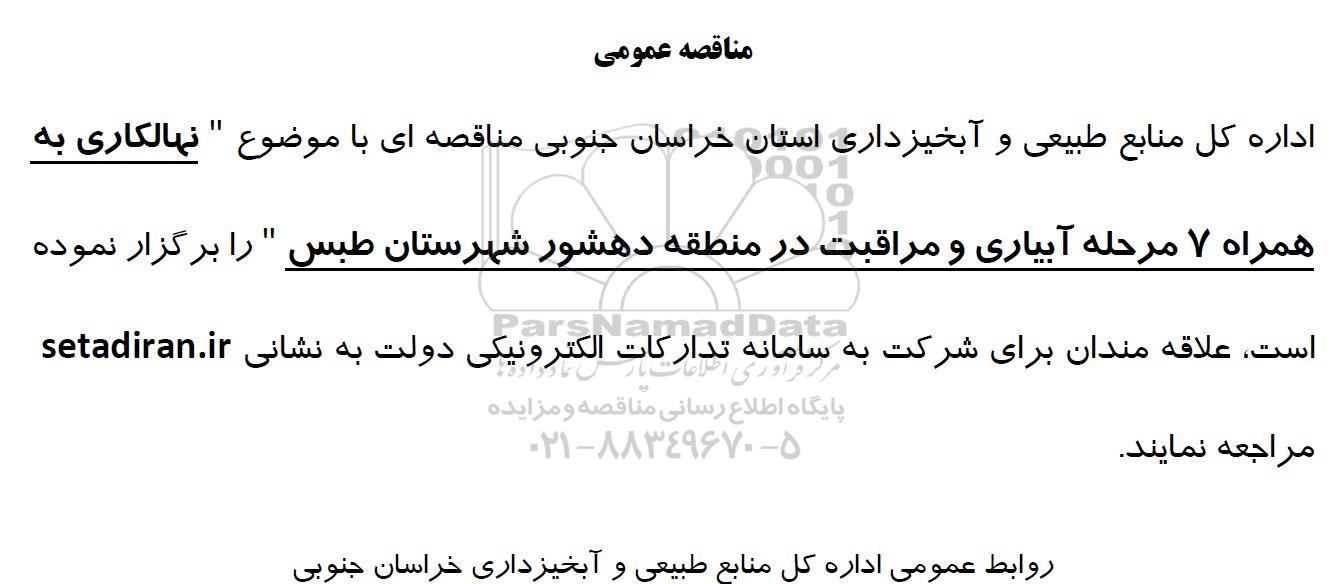 اداره کل منابع طبیعی و آبخیزداری استان خراسان جنوبی مناقصه ای با موضوع «نهالکاری به همراه 7 مرحله آبیاری و مراقبت در منطقه دهشور شهرستان طبس» را برگزار نموده است علاقه مندان برای شرکت به سامانه تدارکات الکترونیکی دولت به نشانی ستاد ایران مراجعه نمایند.