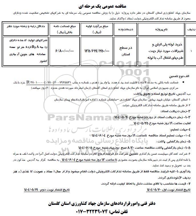 سازمان جهاد کشاورزی استان گلستان در نظر دارد پروژه ذیل را با روش مناقصه عمومی یک مرحله ای به شرکتهای تشخیص صلاحیت شده و دارای مجوز از طریق سامانه تدارکات الکترونیکی دولت (ستاد ) واگذار نماید.