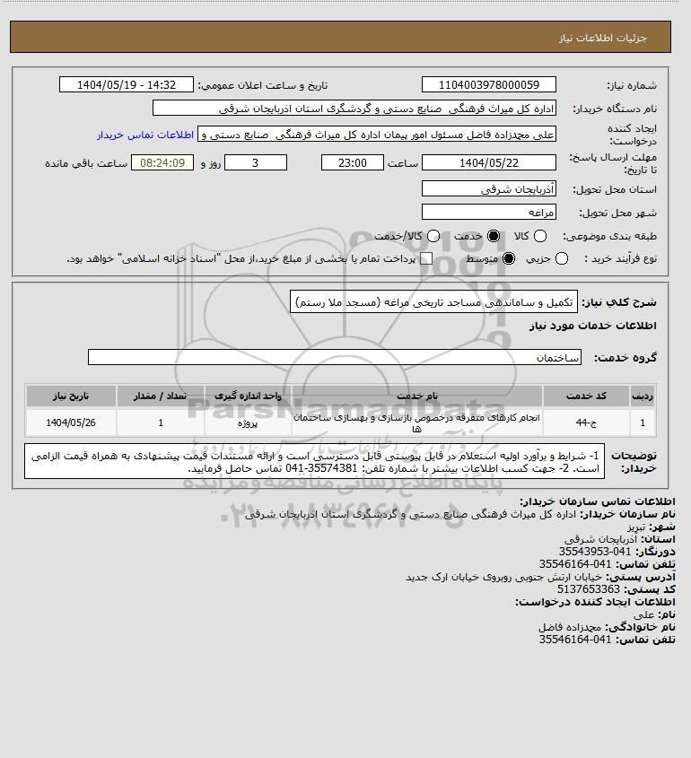 شرح کلی نیاز: تکمیل و ساماندهی مساجد تاریخی مراغه (مسجد ملا رستم)