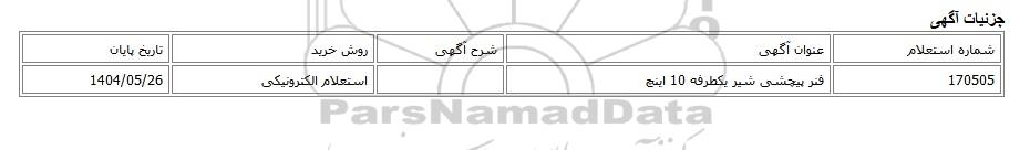 | 170505 | فنر پیچشی شیر یکطرفه 10 اینچ | استعلام الکترونیکی | 1404/05/26 |