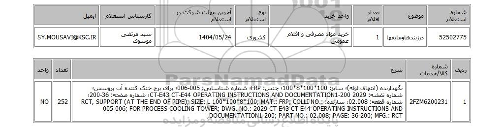 | 52502775 | درزبندهاوعایقها | 1 | خرید مواد مصرفی و اقلام عمومی | کشوری | 1404/05/24 | سید مرتضی موسوی | SY.MOUSAVI@KSC.IR |