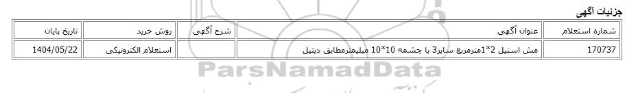 | 170737 | مش استیل 2*1مترمربع سایز3 با چشمه 10*10 میلیمترمطابق دیتیل | استعلام الکترونیکی | 1404/05/22 |