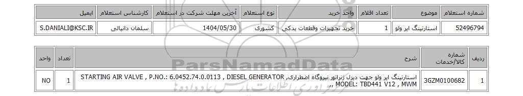 | 52496794 | استارتینگ ایر ولو | 1 | خرید تجهیزات وقطعات یدکی | کشوری | 1404/05/30 | سلمان دانیالی | S.DANIALI@KSC.IR |