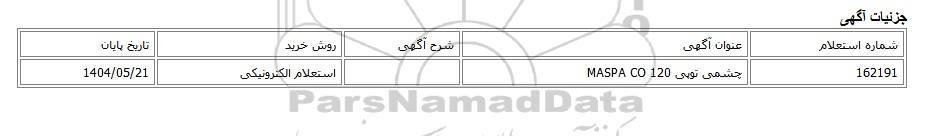 | 162191 | چشمی توپی 120 MASPA CO | استعلام الکترونیکی | 1404/05/21 |