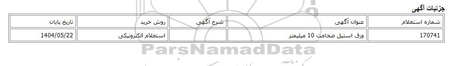 | 170741 | ورق استیل ضخامت 10 میلیمتر | استعلام الکترونیکی | 1404/05/22 |