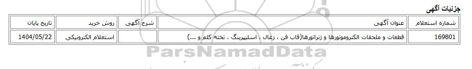 | 169801 | قطعات و ملحقات الکتروموتورها و ژنراتورها(قاب فن ، زغال ، اسلیپرینگ ، تخته کلم و ...) | استعلام الکترونیکی | 1404/05/22 |