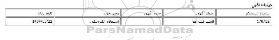 | 170712 | المنت فیلتر هوا | استعلام الکترونیکی | 1404/05/22 |