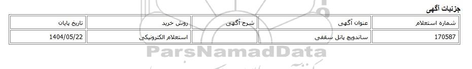 | 170587 | ساندویچ پانل سقفی | استعلام الکترونیکی | 1404/05/22 |