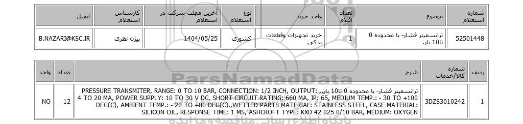 | 52501448 | ترانسمیتر فشار- با محدوده 0 تا10 بار. | 1 | خرید تجهیزات وقطعات یدکی | کشوری | 1404/05/25 | بیژن نظری | B.NAZARI@KSC.IR |
