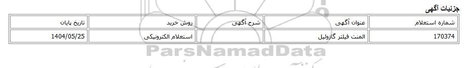 | 170374 | المنت فیلتر گازوئیل | استعلام الکترونیکی | 1404/05/25 |
