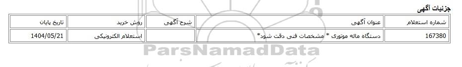 | 167380 | دستگاه ماله موتوری * مشخصات فنی دقت شود* | استعلام الکترونیکی | 1404/05/21 |