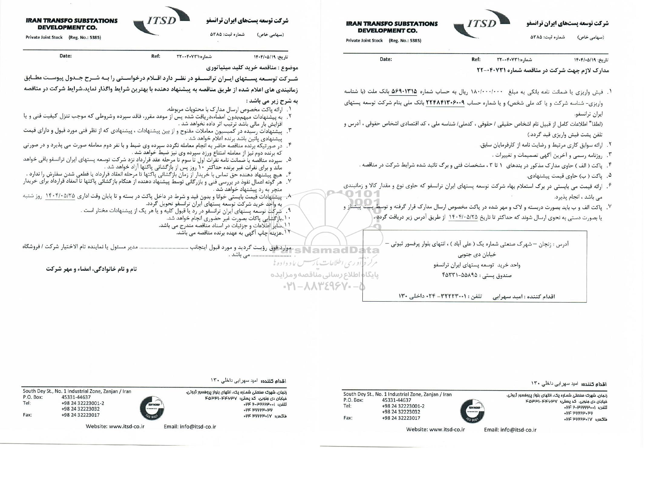 شرکت توسعه پستهای ایران ترانسفو در نظر دارد اقلام درخواستی را به شرح جدول پیوست مطابق زمانبندی های اعلام شده از طریق مناقصه به پیشنهاد دهنده با بهترین شرایط واگذار نماید شرایط شرکت در مناقصه