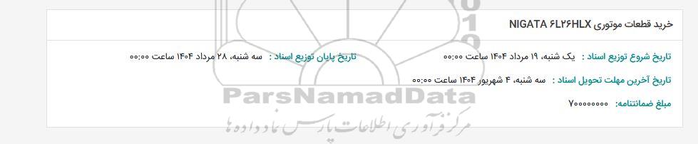 علاقهمندان میتوانند جهت دریافت اسناد و اطلاعات تکمیلی، مناقصه خرید قطعات موتوری NIGATA 6L26HLX با سامانه مناقصات و مزایدات ایران پارسنماد داده ها 88349670 تماس حاصل نمایند.