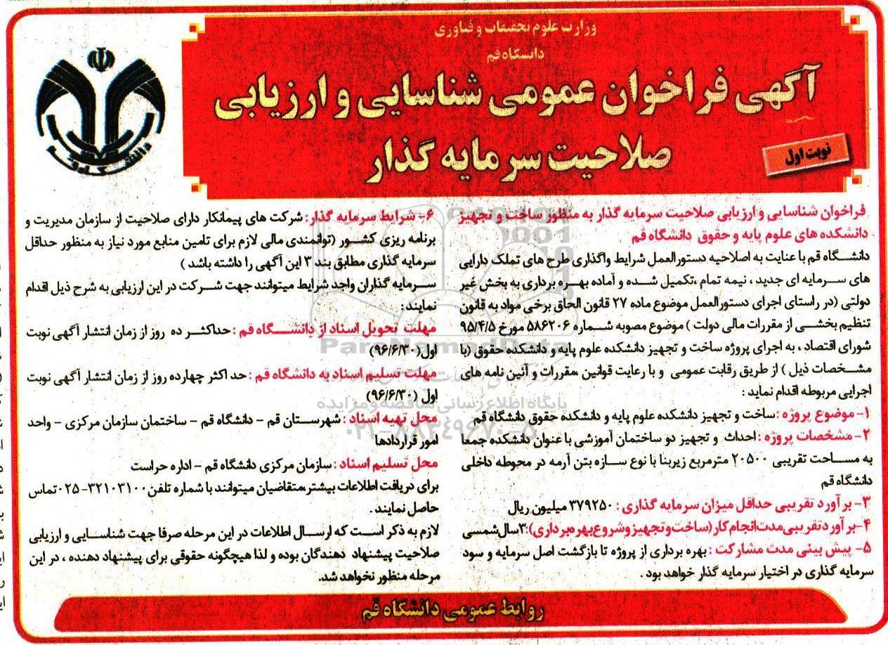 فراخوان شناسایی و ارزیابی صلاحیت سرمایه گذار به منظور ساخت و تجهیز دانشکده های علوم پایه و حقوق دانشگاه قم