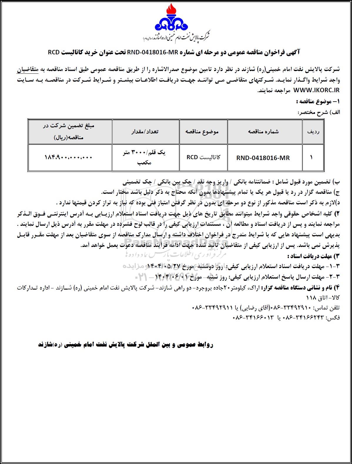 آگهی فراخوان مناقصه عمومی دو مرحله ای شماره RND - 0418016 -MR تحت عنوان خرید کاتالیست RCD