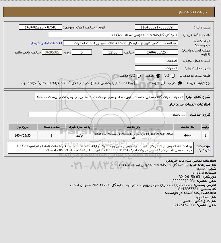 شرح کلی نیاز: اصفهان اجرای کناف سالن جلسات طبق تعداد و موارد و مشخصات مندرج در توضیحات و پیوست سامانه