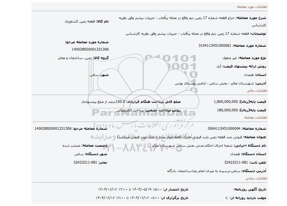 | شرح مورد معامله: حراج قطعه شماره 17 زمین دیم واقع در محله برآفتاب - جزییات بیشتر وفق نظریه کارشناس | نام کالا: قطعه زمین کشاورزی | |