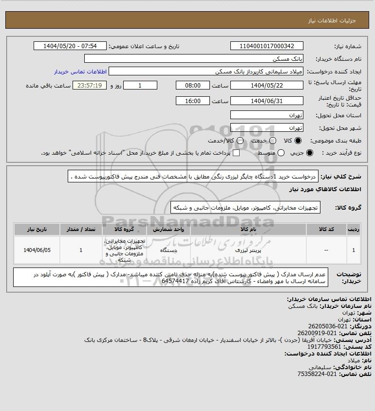 استعلام درخواست خرید 1دستگاه چاپگر لیزری رنگی مطابق با مشخصات فنی مندرج پیش فاکتورپیوست شده ., استعلام درخواست خرید 1دستگاه چاپگر لیزری رنگی مطابق با مشخصات فنی مندرج پیش فاکتورپیوست شده .