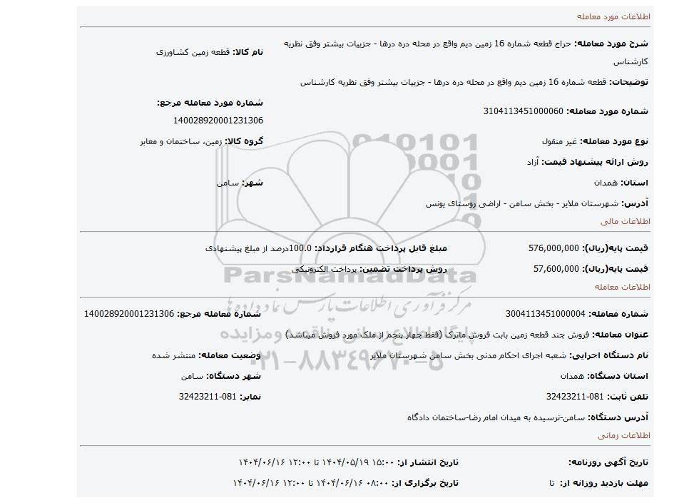 مزایده قطعه شماره 16 زمین دیم واقع در محله دره درها - جزییات بیشتر وفق نظریه کارشناس, مزایده، قطعه شماره 16 زمین دیم واقع در محله دره درها - جزییات بیشتر وفق نظریه کارشناس