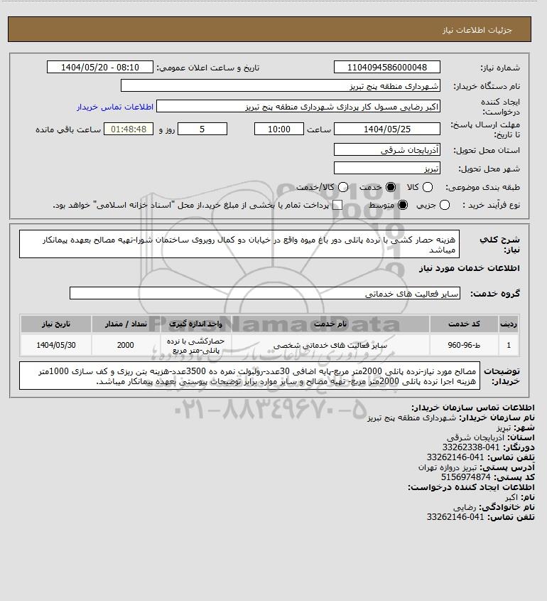 شرح کلی نیاز: هزینه حصار کشی با نرده پانلی دور باغ میوه واقع در خیابان دو کمال روبروی ساختمان شورا-تهیه مصالح بعهده پیمانکار میباشد