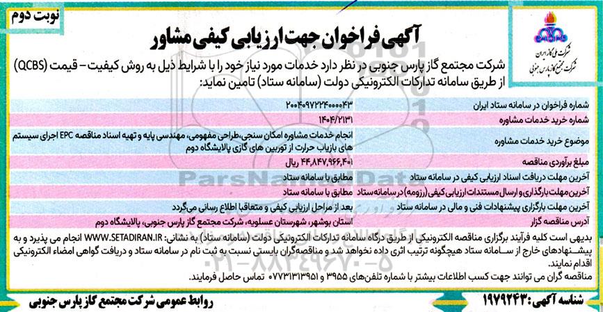 شرکت مجتمع گاز پارس جنوبی در نظر دارد خدمات مورد نیاز خود را با شرایط ذیل به روش کیفیت - قیمت (QCBS) از طریق سامانه تدارکات الکترونیکی دولت سامانه ستاد تامین نماید