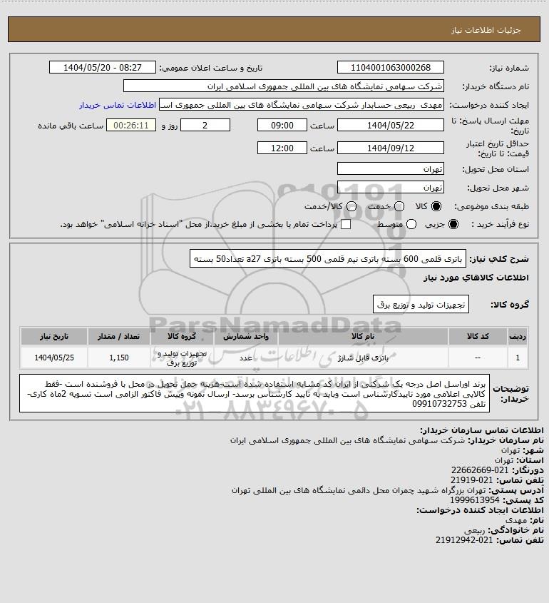 شرح کلی نیاز: باتری قلمی 600 بسته باتری نیم قلمی 500 بسته باتری a27 تعداد50 بسته