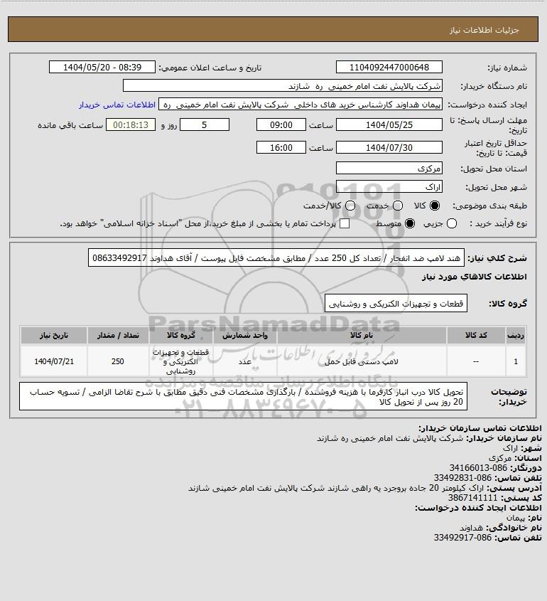 شرح کلی نیاز: هند لامپ ضد انفجار / تعداد کل 250 عدد / مطابق مشخصت فایل پیوست / آقای هداوند 08633492917