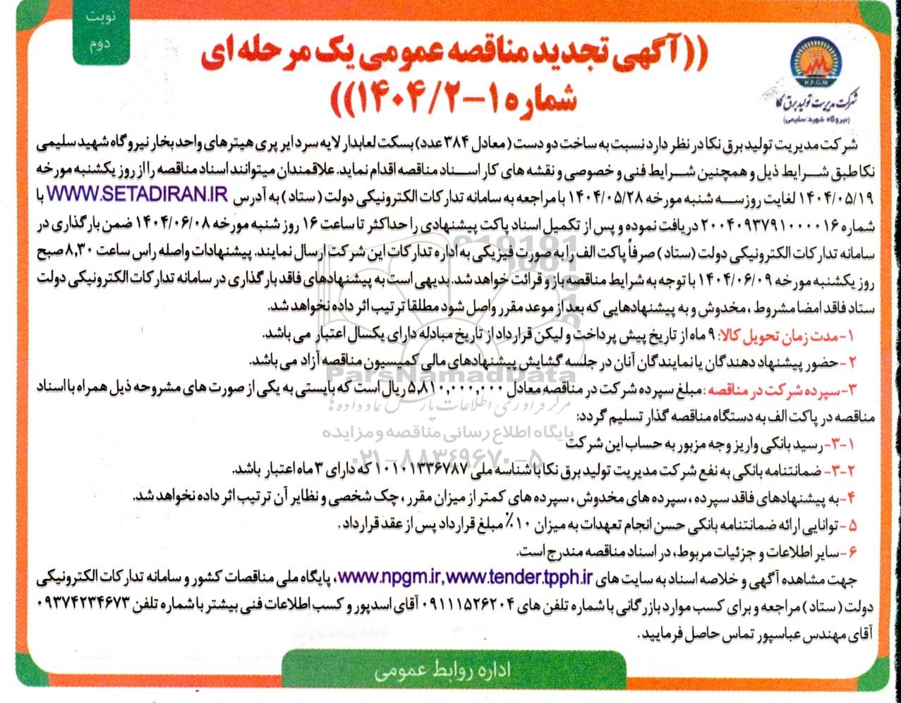 شرکت مدیریت تولید برق نکا در نظر دارد نسبت به ساخت دو دست معادل 384 عدد بسکت لعابدار لایه سرد آب پری هیترهای واحد بخار نیروگاه شهید سلیمی نکا طبق شرایط ذبل و همچنین شرایط فنی و خصوصی و نقشه کار اسناد مناقصه اقدام نماید. علاقمندان میتوانند اسناد مناقصه را از روز یکشنبه مورخه 1404.05.19 لغایت روز سه شنبه مورخه 1404.05.28 با مراجعه به سامانه تدارکات الکترونیکی دولت (ستاد) به آدرس ستاد ایران با شماره 2004093791000016 دریافت نموده و پس از تکمیل استاد پاکت پیشنهادی را حداکثر تا ساعت 16 روز شنبه مورخه 1404.06.08 ضمن بارگذاری در سامانه تدارکات الکترونیکی دولت (ستاد) صرفا پاکت الف را به صورت فیزیکی به اداره تدارکات این شرکت ارسال نمایند پیشنهادات واصله راس ساعت 8.30 صبح روز یکشنبه مورخه 1404.06.09 با توجه به شرایط مناقصه باز و فرانت خواهد شد. بدیهی است به پیشنهادهای فاقد بارگذاری در سامانه تدارکات الکترونیکی دولت ستاد فاقد امضا مشروط، مخدوش و به پیشنهادهایی که بعد از موعد مقرر واصل شود مطلقا ترتیب اثر داده نخواهد شد.
