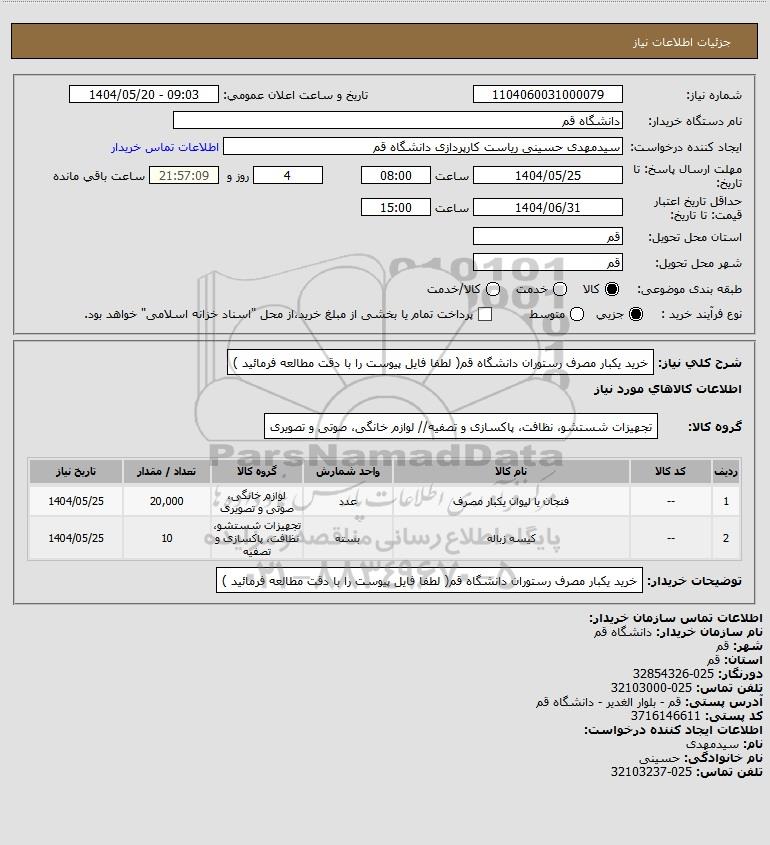 شرح کلی نیاز: خرید یکبار مصرف رستوران دانشگاه قم( لطفا فایل پیوست را با دقت مطالعه فرمائید )