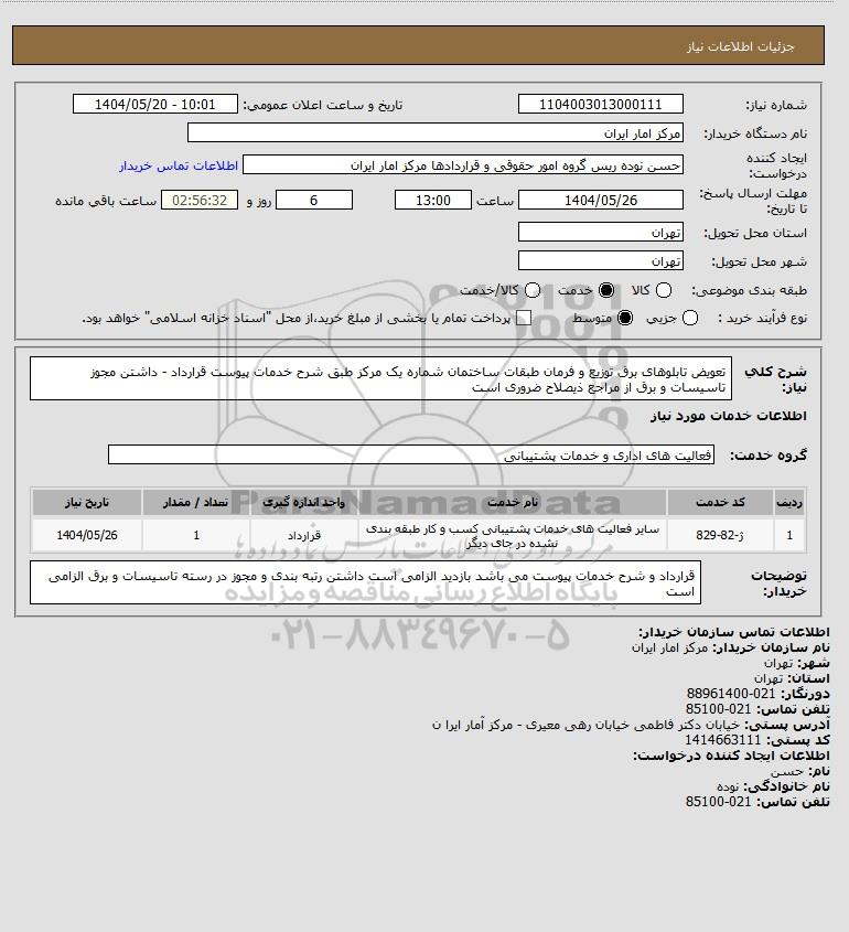 شرح کلی نیاز: تعویض تابلوهای برق توزیع و فرمان طبقات ساختمان شماره یک مرکز طبق شرح خدمات پیوست قرارداد - داشتن مجوز تاسیسات و برق از مراجع ذیصلاح ضروری است