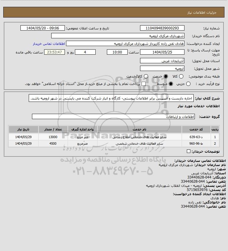 شرح کلی نیاز: اجاره داربست و اسپیس برابر اطلاعات پیوستی- کارگاه و انبار شرکت کننده می بایستی در شهر ارومیه باشد.