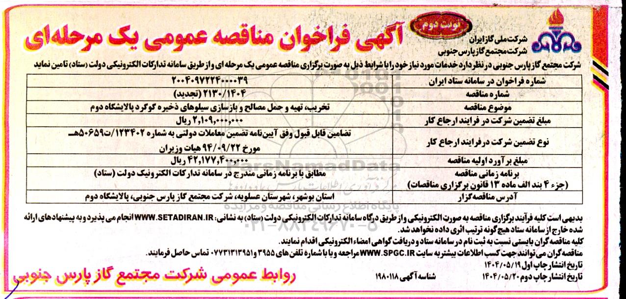 مناقصه تخریب ،تهیه و حمل مصالح و بازسازی سیلوهای ذخیره گوگرد تجدید- نوبت دوم از کلیه افراد متخصص و شرکتها واجد شرایط دعوت به عمل میآید در مناقصه با کد خبرگزاری پارس نماد: 9392411 شرکت نمایند.