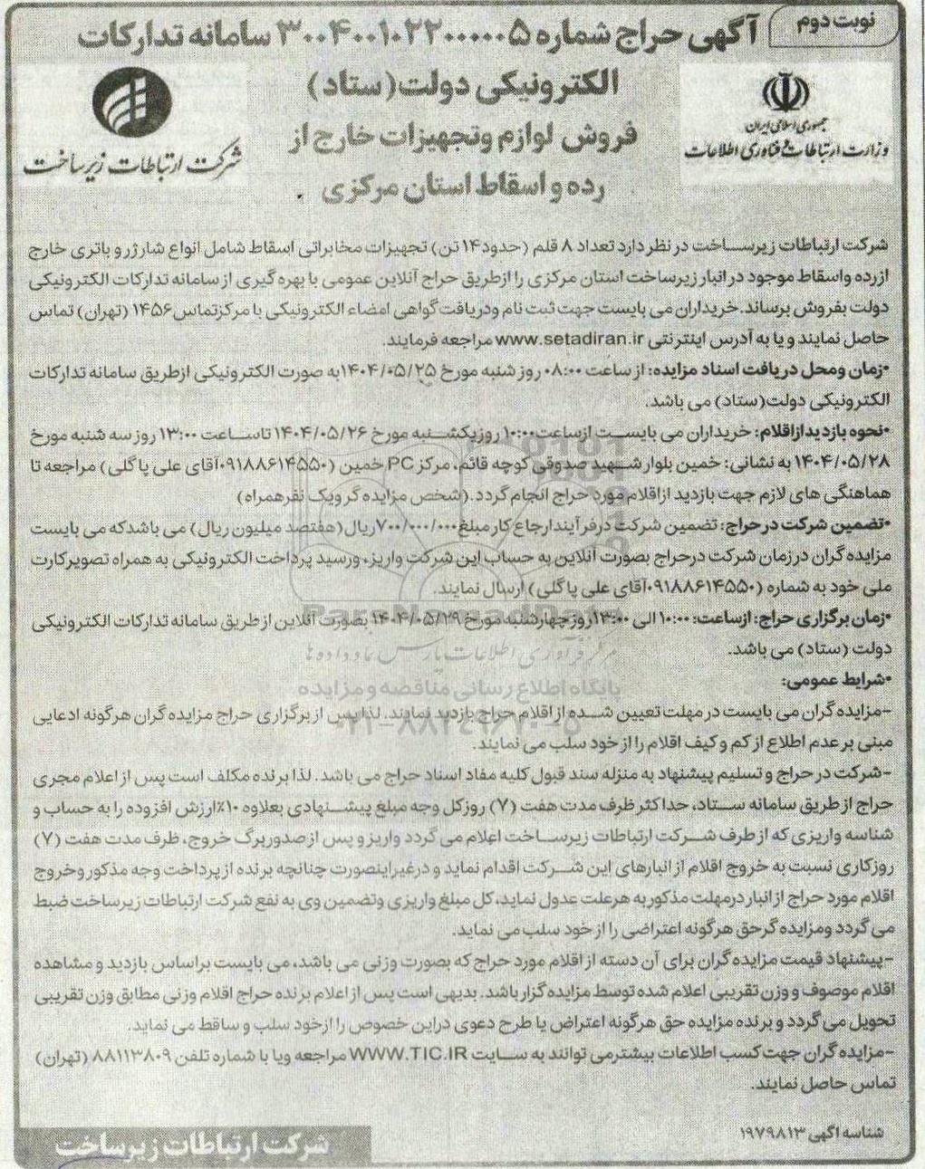 شرکت ارتباطات زیر ساخت در نظر دارد تعداد 8 قلم (حدود 14 تن) تجهیزات مخابراتی اسقاط شامل انواع شارژر و باتری خارج از رده و اسقاط موجود در انبار زیر ساخت استان مرکزی را از طریق حراج آنلاین عمومی با بهره گیری از سامانه تدارکات الکترونیکی دولت بفروش برساند. خریداران میبایست جهت ثبت نام و دریافت گواهی امضاء الکترونیکی با مرکز تماس 1456 (تهران) تماس حاصل نمایند و یا به آدرس اینترنتی ستاد ایران مراجعه فرمایند.