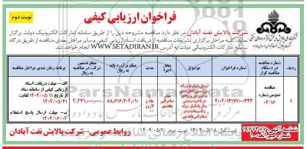 فراخوان ارزیابی کیفی تبدیل خطوط شبکه زیرزمینی کابل مسی به فیبر نوری ... نوبت دوم , فراخوان ارزیابی کیفی تبدیل خطوط شبکه زیرزمینی کابل مسی به فیبر نوری ... نوبت دوم